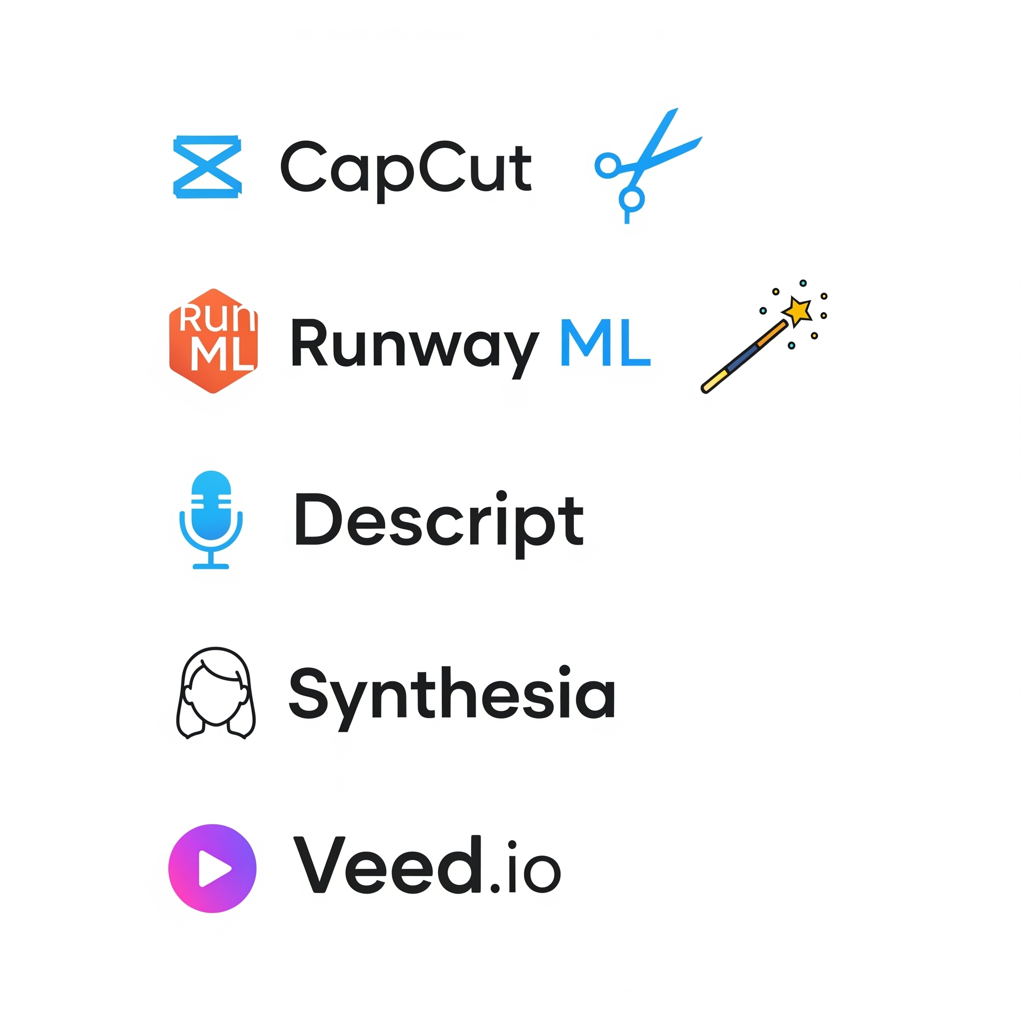 이 글에서 소개해 드린 CapCut, Runway ML, Descript, Synthesia, Veed.io는
